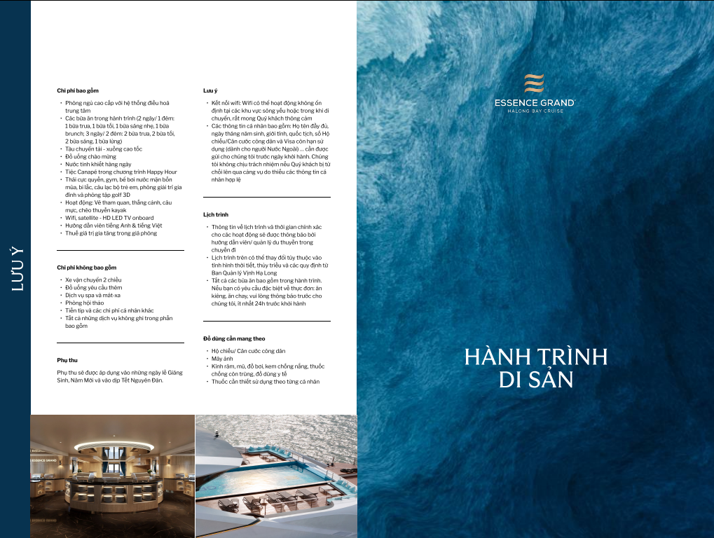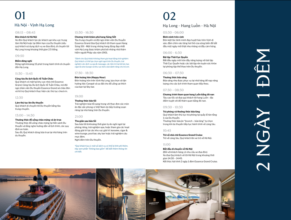 Essence Grand Halong Bay Cruise I là một sản phẩm siêu du thuyền xanh, an toàn và hiện đại đầu tiên và bậc nhất trên Vịnh di sản. Đây có thể coi là một siêu phẩm được tạo nên bởi trí tuệ và nhân lực Việt từ khâu lên ý thưởng thiết kế đến quá trình đóng tàu và hoàn thiện.