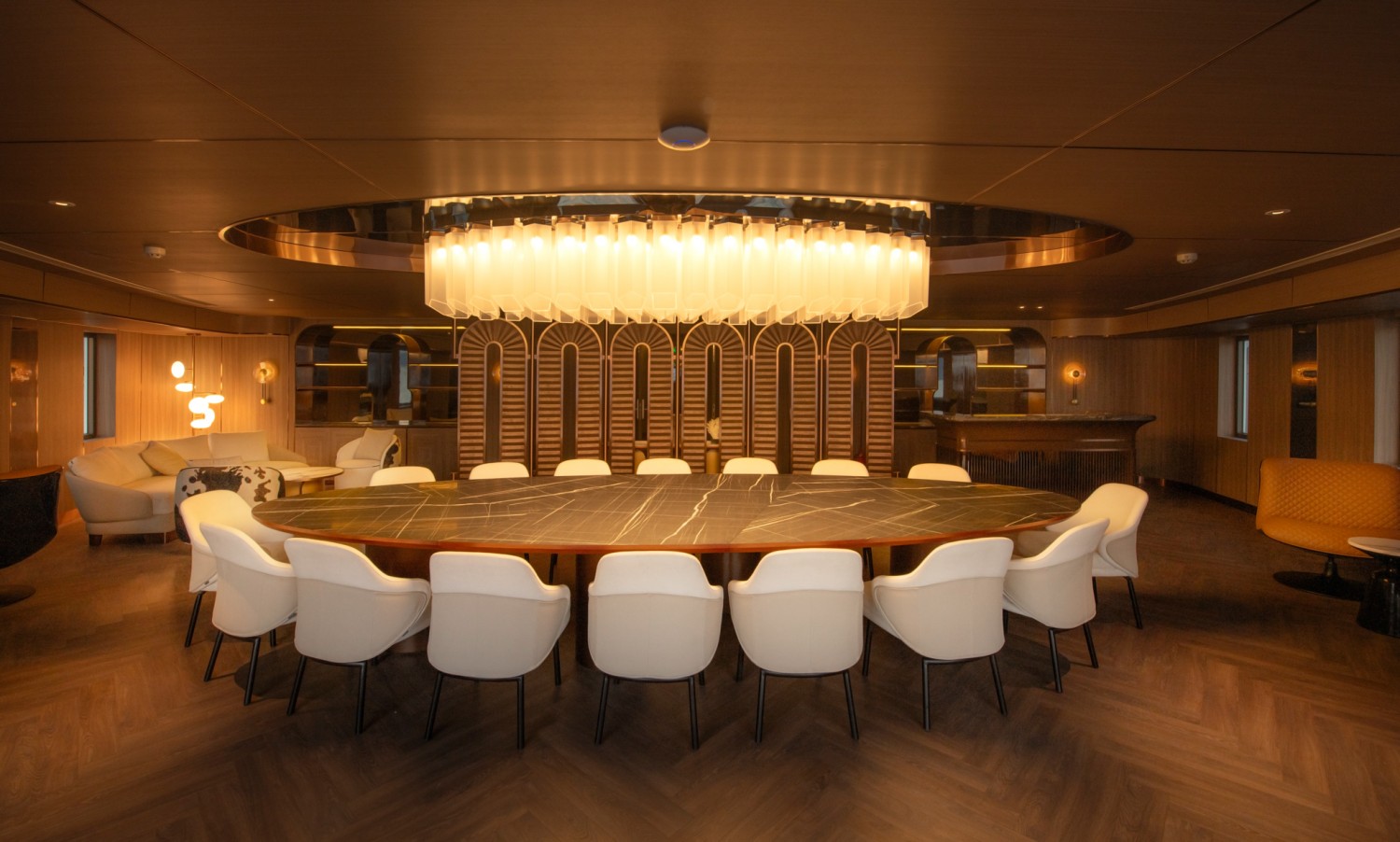 Toàn bộ nội thất được chế tác từ gỗ công nghiệp (cây trồng công nghiệp để lấy gỗ), thay vì khai thác rừng lâu năm, gây nguy hại cho môi trường. Sàn tàu được làm bằng chất liệu tre biến tính – thân thiện với môi trường. Các dụng cụ trên du thuyền như các đồ dùng một lần, vỏ chai nước,… đều được ưu tiên sử dụng những nguyên liệu có thể tái chế.